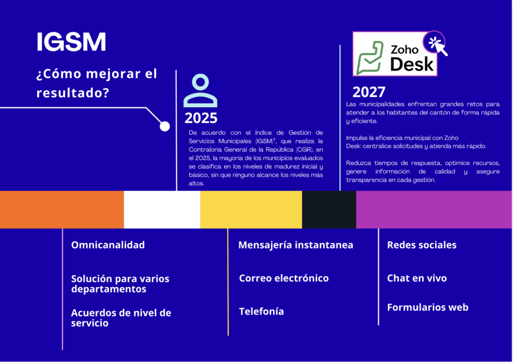 En el entorno municipal, Zoho Desk, puede ser definida como una herramienta que ayuda a los alcaldes, directores, jefes, responsables, encargados de tecnologías de información y comunicación, contraloría de servicios o todas aquellas unidades relacionadas directamente con la prestación de servicios básicos municipales a centralizar las diferentes solicitudes, optimizar el servicio al cliente y transformar digitalmente la prestación de los servicios.